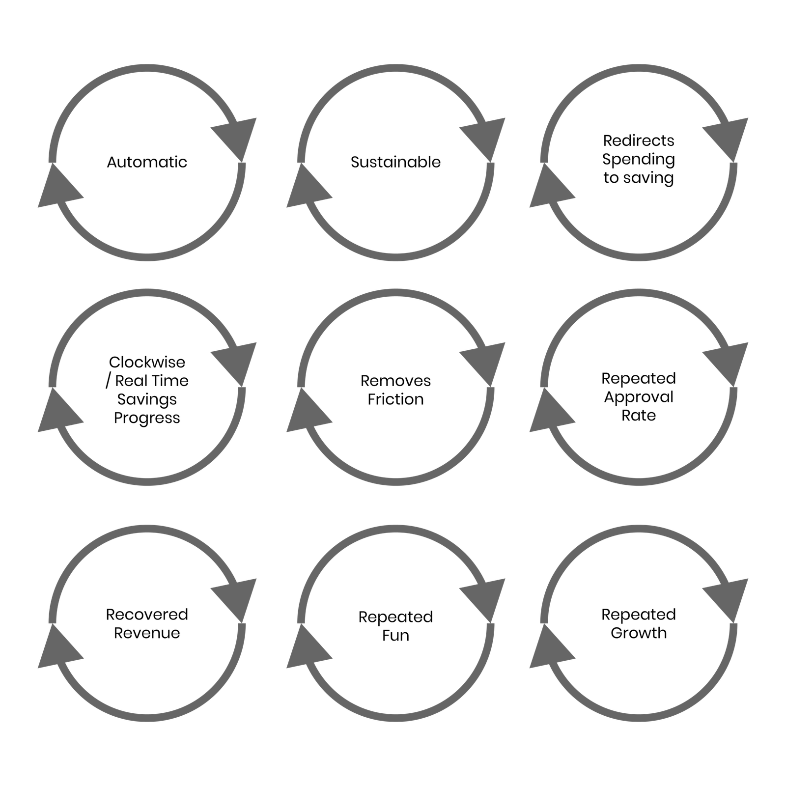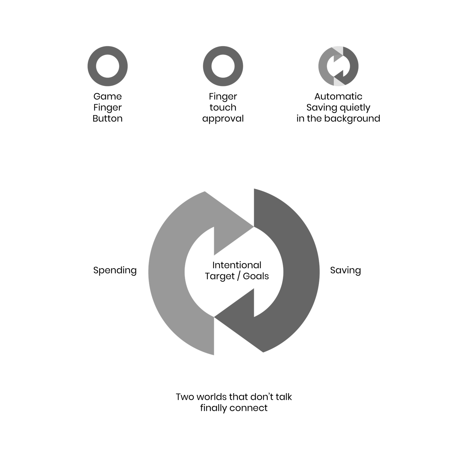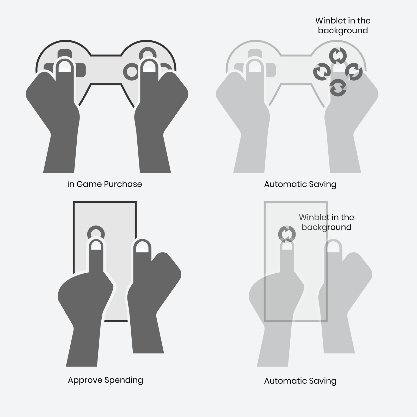 It was amazing to find out all the major words that appeared in Winblet, like Automatic, Sustainable, Recover, Repeat, Redirect, and No friction unbelivably all share the same symbol. Two circular arrows that follow each other. It’s almost like finally connecting two worlds that never talked. Hence, this mark was customised, circularly and uniquely stylised to depict the two worlds: Spending & Saving in an automatic, sustainable, redirect and repeatable manner. It also happened to look like an automated circling process in the background of pressed game buttons or pressed approval spending buttons.