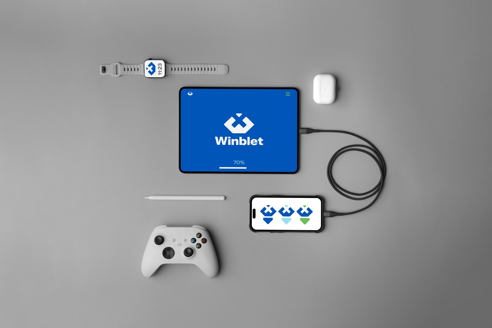 And it so happened that this mark came out of a portion of the game controller’s cross button to symbolise saving as easily as pressing the game play button that also happens to form the winning stance of a person holding a trophy, illustrated in minimalist style that also serves as a graphic that helps to differentiate the three Winblet entities by simply applying three meaningful colors: blue for the studio itself and for game studios, light blue for parents’ app and green for childrens’ growth app.
